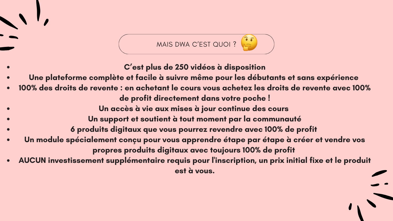 AccÚdez maintenant à la formation et tous ses modules. Vous pourrez revendre la DWA une fois la totalité du paiement effectué.